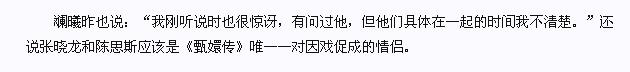 但两人关系至今为止一直有点扑朔迷离,最早是在某个发布会上由沈眉庄的扮演者斓曦曝料说他们俩是《甄嬛传》这部戏唯一促成的一对。