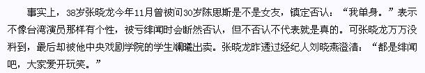 但张晓龙否认了,他表示自己是单身,不否认绯闻也不代表那就是真的。他的经纪人也多次帮他澄清这是大家开的玩笑而已。